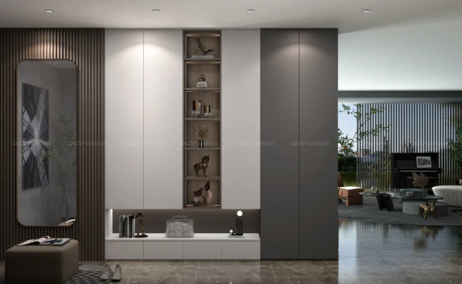 撞色設計,灰白分明。一深一淺,一長一短,一虛一實,簡潔大方,從容有度,隨處可見高級感。中間留空,加上藏光,在格柵背景墻上擺放穿衣鏡,極其便捷。沒有太過繁華的修飾,讓整個家更具舒適雅致的氛圍。