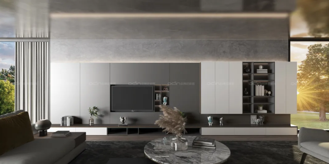 輕奢·拾光,時光蹉跎,歲月荏苒。將視線放到客廳區域,大理石圓形茶幾,透露出博覽與包容的智慧。流行的膚感柔白、膚感雅灰相互映襯,橡木紋理箱體質感豐富搭配整體對稱的間架營造出溫暖的氛圍又不失層次感。