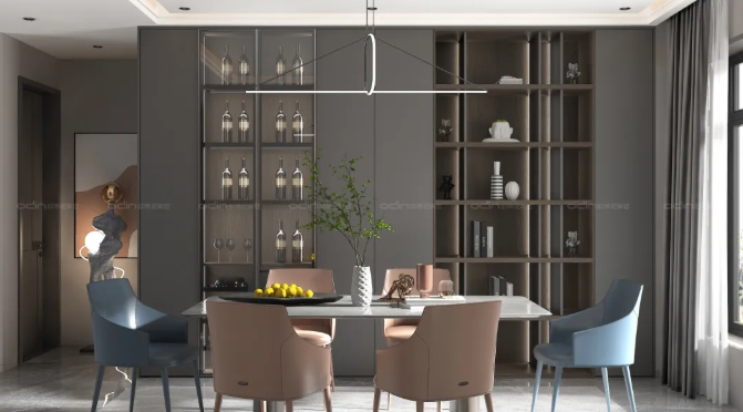 集觀賞與實用為一體的酒柜,珍藏別樣的愜意。靈動的吊燈,摒棄炫耀與夸張,把美含蓄地融入到空間的每一個細節。簡約的線條、打破傳統的非對稱設計更為合理的餐桌邊收納布局,彰顯了設計者對餐廳空間的精細琢磨,隨手放置的水杯、書刊從此都擁有了自己所屬的小屋。