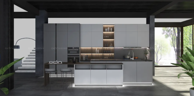 一深一淺的組合,簡潔明了。采用一字型加島臺的組合形式,穩重大氣,與整體的極簡的設計風格相得益彰。島臺采用的是體快穿插的設計手法,形式新穎,富有設計感。車水馬龍,萬家燈火。到家的一刻,方知曉家始終是你最后的避風港。從出走看風景,到歸來看風景。